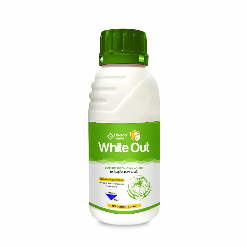 White Out (Diafenthiuron 47.8% w/w SC) is a broad-spectrum insecticide that is used to control a variety of insects, including aphids, jassids, thrips, and whiteflies. It is a non-systemic insecticide, which means that it does not enter the plant that it is applied to. Instead, it works by contact and ingestion, killing the insect when it comes into contact with the insecticide or eats something that has been treated with it. It acts as a mitochondrial electron transport inhibitor, blocking the production of ATP and disrupting the energy balance in the pests cells. As a result, the pests become paralyzed and eventually die.