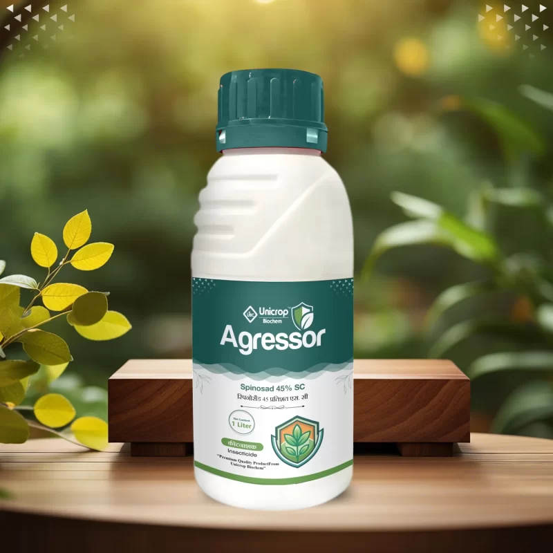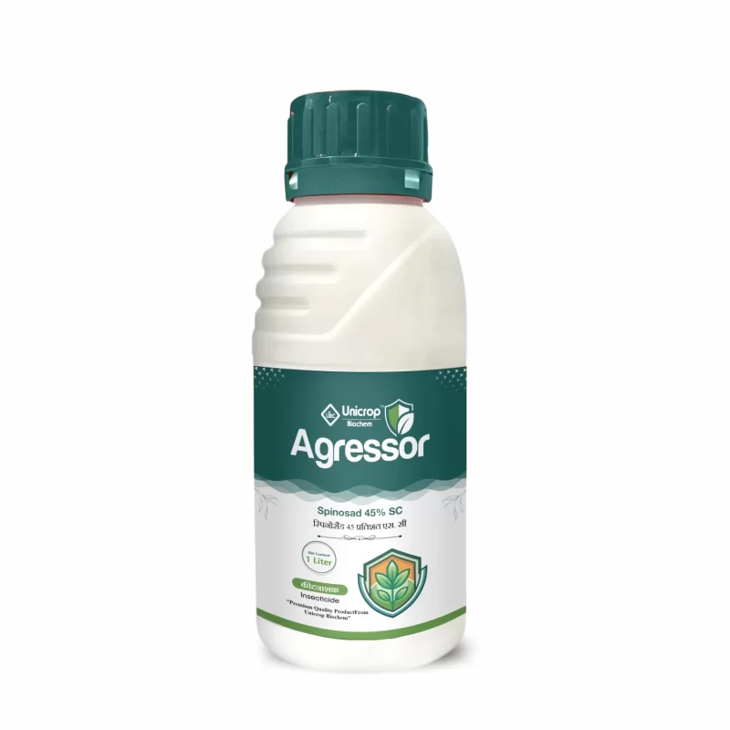 Agressor is a Biological insecticide containing Spinosad (45%) in a Suspension concentrate formulation. It effectively controls a wide range of insect pests through contact and ingestion, which causes excitation of the insect nervous system. This insecticide is suitable for agricultural use against pests such as fruit and shoot borer, Boll worms, Thrips, etc., in crops like Cotton, Chili, Redgram, and many other fruit and vegetable crops. Spinosad 45% SC is a Biological insecticide derived from the naturally occurring bacteria Saccharopolyspora spinosa. It affects the pest through contact and ingestion, leading to involuntary muscle contractions, prostration with tremors, and finally, paralysis.