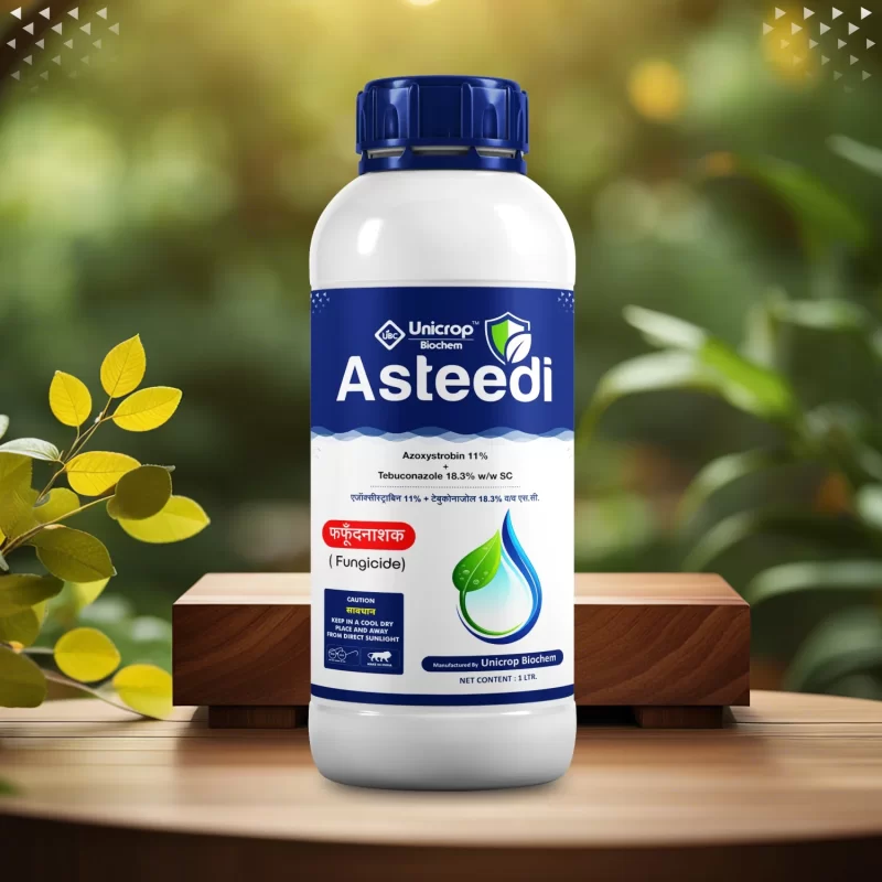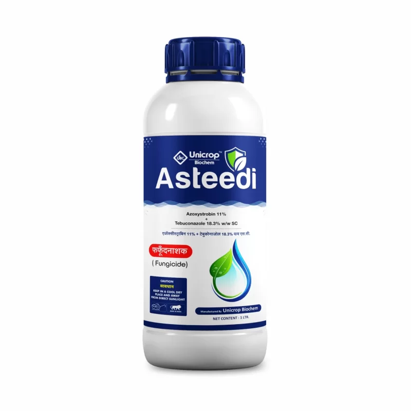 Asteedi is a fungicide containing Azoxystrobin 11% & Tebuconazole 18.3% w/w SC. It inhibits respiration and ergosterol synthesis of the fungus. Asteedi is a powerful combination of Triazole and Strobilurin chemistries & it exhibits systemic and trans-laminar movement and disperse rapidly in plant system.