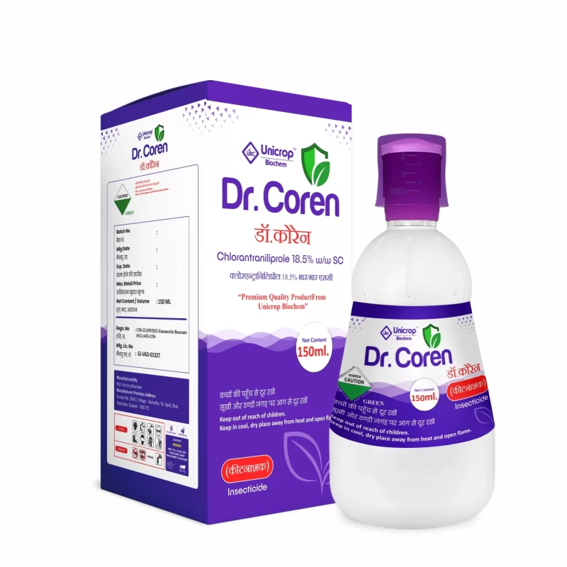 Dr. Coren Insecticide is an anthranilic diamide. Broad spectrum insecticide in the form of a suspension concentrate. It is powered by the active ingredient Rynaxypyr which has a unique mode of action that controls pests resistant to other insecticides. Exposed insects stop feeding within minutes and extended residual activity protects crops longer than competitive options. It spreads and acts fast, resulting in quick control of insects.