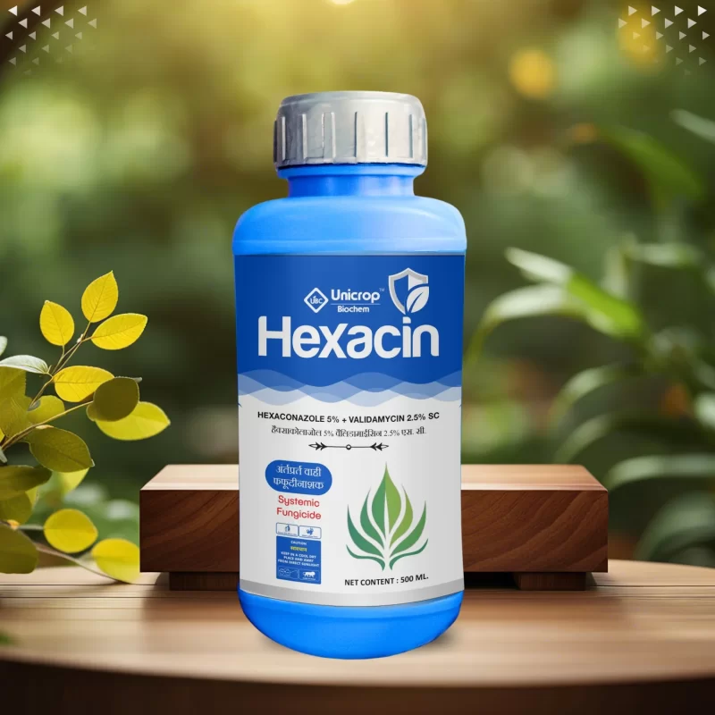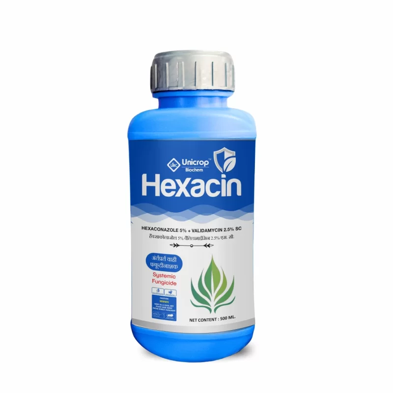 Hexacin is a systematic fungicide containing 5 % hexaconazole and 2.5% validamycin active ingredient along with adjuvant it is recommended for control of sheath blight and blast disease in paddy crop.