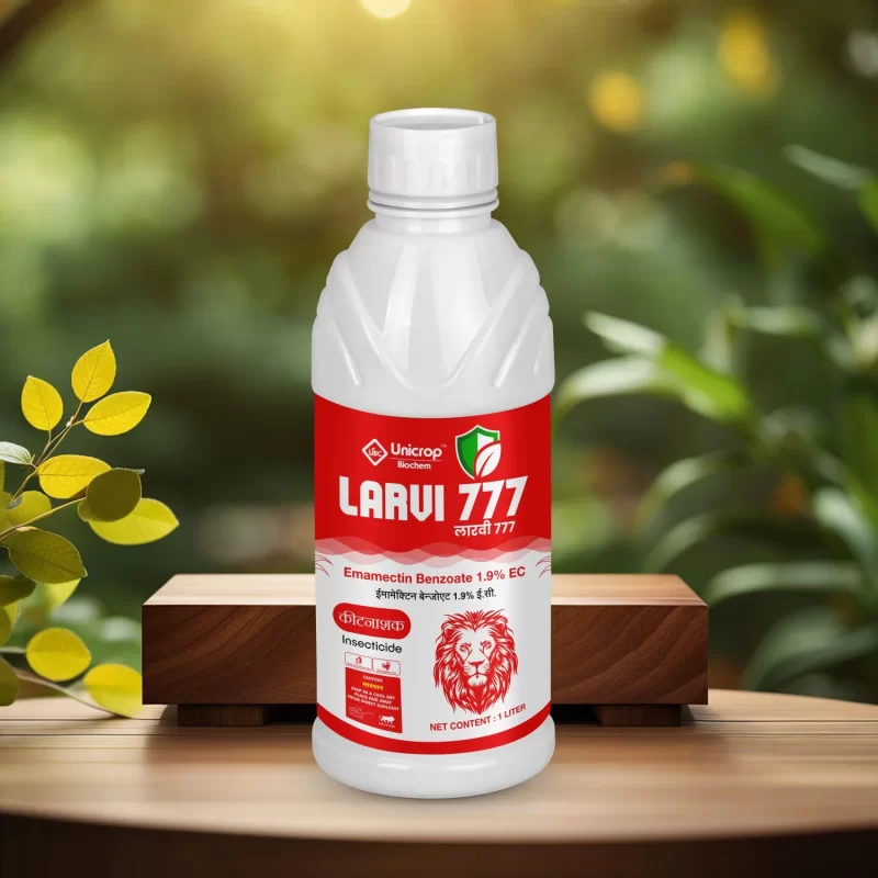 Larvi 777 (Emamectin benzoate 1.9% E.C) is a highly potent insecticide cum acaricide. Even though Emamectin benzoate 1.9% E.C displays a broad spectrum pest control action. Emamectin benzoate 1.9% E.C is a macrocyclic insecticide that remains stable post aqueous hydrolysis. For some vegetables, fruits and cereals Emamectin benzoate 1.9% E.C can be used as an acaricide occasionally. Emamectin benzoate 1.9% E.C has both systemic and contact action. Upon coming in contact with the chemical, the effect of neurotransmitter gets intensified in the insect pests. This leads to disturbed neurotransmission. Further, the pests stop feeding on the plants and eventually die.