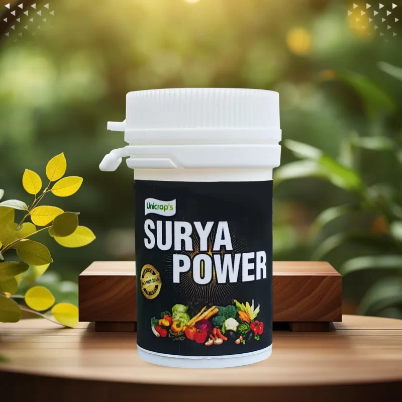 Foliar Spray: Dissolve 2 grams of SURYA POWER in 15 liters of clean water. Spray uniformly on crop foliage during the early bud initiation stage. Repeat application every 12–15 days during flowering and fruit-setting periods for sustained results. Avoid spraying during hot and sunny conditions to prevent potential leaf burn. Repeat applications at regular intervals throughout the growing season to sustain plant vigor and optimize yield potential.