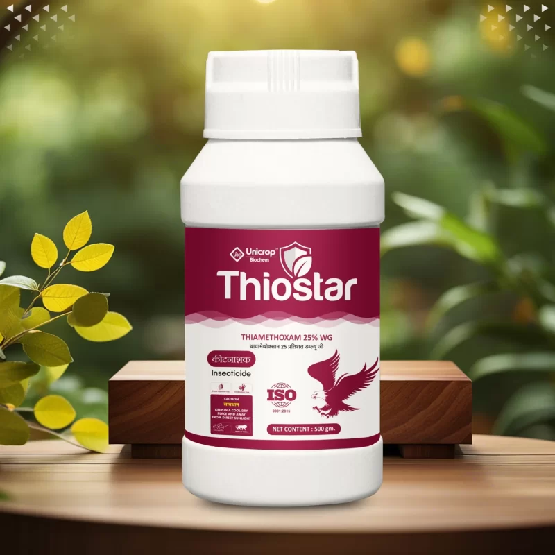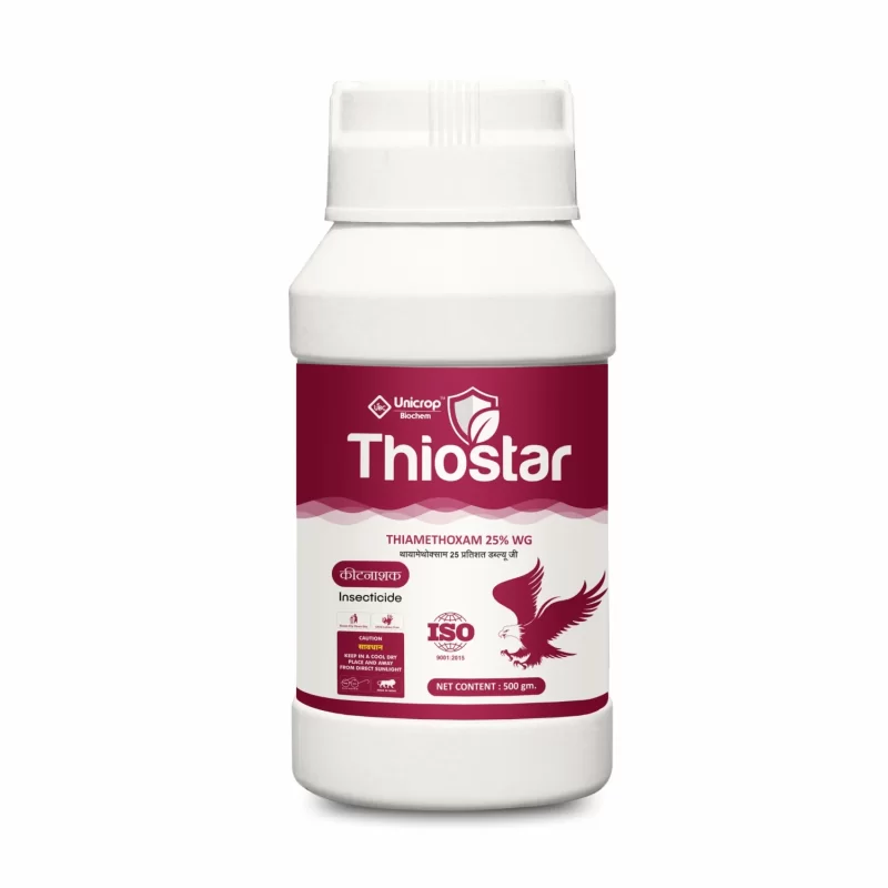Thiostar (Thiamethoxam 25% WG) is a pesticide formulation that contains thiamethoxam as the active ingredient. This formulation is primarily used to control a wide range of insect pests in various agricultural and horticultural crops. Thiostar is absorbed quickly by plants and transported to all of its parts, including pollen, where it acts to deter insect feeding. An insect can absorb it in its stomach after feeding, or through direct contact, including through its tracheal system. The compound gets in the way of information transfer between nerve cells by interfering with nicotinic acetylcholine receptors in the central nervous system, and eventually paralyzes the muscles of the insects.