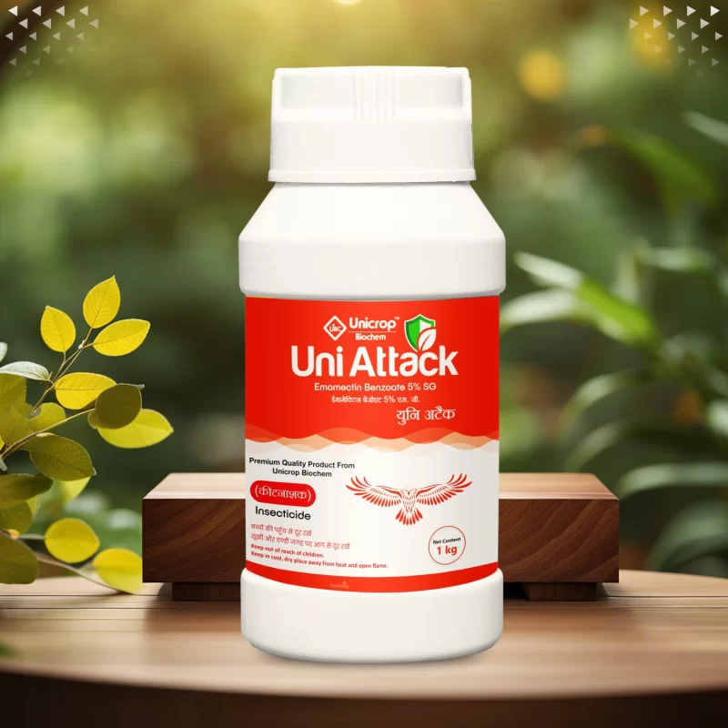 Uni Attack containing Emamectin Benzoate 5% SG is a multipurpose world-renowned soluble granular insecticide. It is a modern insecticide that belongs to the avermectin group. Highly effective on all stages of larva and resistant pest species. Due to its translaminar activity penetrates into leaf tissues and forms a reservoir within the leaf. It inhibits muscle contraction, causing a continuous flow of chlorine ions in the GABA and H-Glutamate receptor sites. Affected larvae become paralyzed and stop feeding shortly after exposure to Insecticide and subsequently die after 2-4 days.