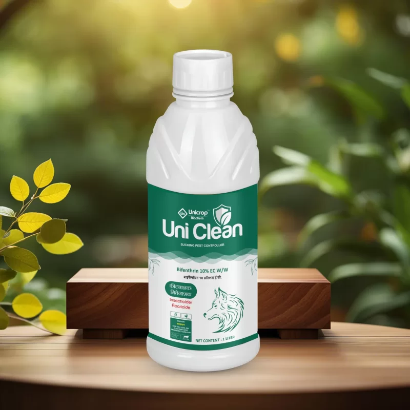 Uni Clean (Bifenthrin 10% EC w/w) is a highly versatile insecticide that offers convenient application through various agricultural practices due to its easy solubility in water. This potent insecticide exhibits both contact and systemic actions, ensuring effective pest control on plants. When insects come into direct contact with Bifenthrin on the plant surface, it swiftly eliminates them. Moreover, its systemic action enables the insecticide to be absorbed by the plants and transported through their tissues. This systemic movement allows Bifenthrin to target pests that may be hidden or feeding on different parts of the plant, delivering comprehensive protection and aiding in the eradication of a wide range of troublesome insects.