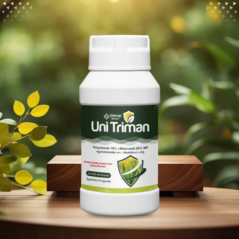 Uni Triman fungicide is a unique combination of contact and systemic fungicide, Tricyclazole, and Mancozeb. It is a one-shot fungicide for the control of all types of blast, brown leaf spot and grain discoloration diseases. Uni Triman has a wide spectrum of use in many crops. Tricyclazole is a systemic fungicide that acts as a protectant, preventing fungal penetration and is especially effective against rice blast disease. On the other hand, Mancozeb is a contact fungicide that provides broad-spectrum protection by inactivating the sulphahydral (SH) groups in fungal enzymes, crucial for their metabolic activities. Together, these components provide robust disease control, safeguarding crops from a variety of fungal threats.