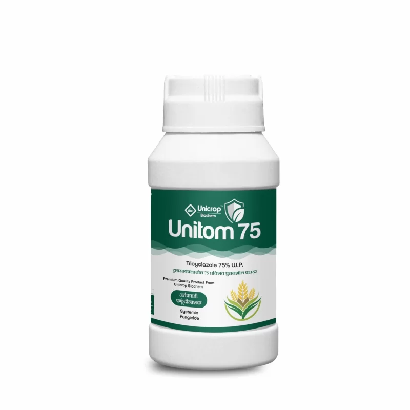 Unitom 75 (Tricyclazole 75% WP) is a fungicide specifically designed to control rice blast disease. It inhibits fungal growth by disrupting melanin production. This systemic and protective fungicide offers residual activity, providing long-lasting protection against rice blast. Unitom 75 fungicide is rapidly absorbed by rice plant and translocated towards leaf tips. It is a protectant fungicide that prevents the fungus from penetrating the plant. Inhibition occurs when the fungus attempts to penetrate and establish an infection site inside the plant.