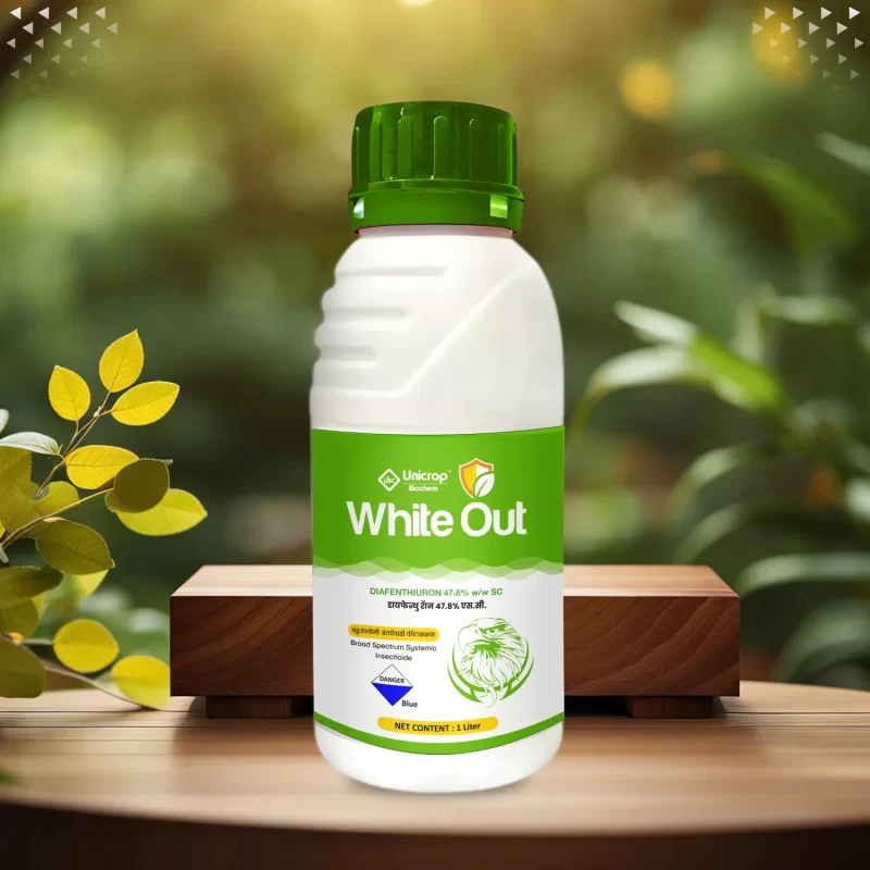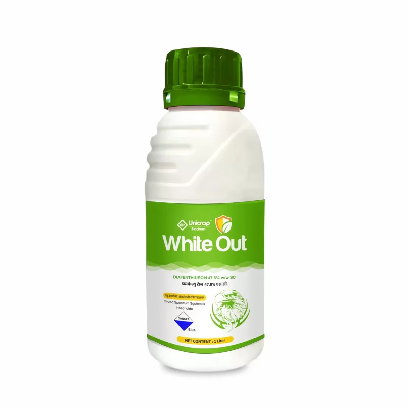 White Out (Diafenthiuron 47.8% w/w SC) is a broad-spectrum insecticide that is used to control a variety of insects, including aphids, jassids, thrips, and whiteflies. It is a non-systemic insecticide, which means that it does not enter the plant that it is applied to. Instead, it works by contact and ingestion, killing the insect when it comes into contact with the insecticide or eats something that has been treated with it. It acts as a mitochondrial electron transport inhibitor, blocking the production of ATP and disrupting the energy balance in the pests cells. As a result, the pests become paralyzed and eventually die.